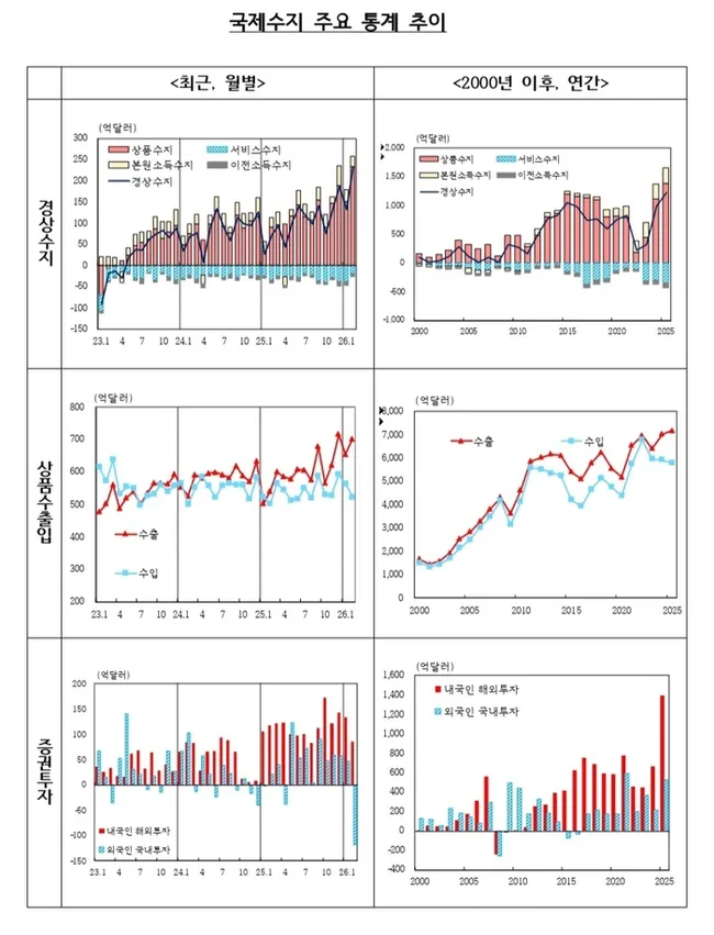 외국인 국내 주식 투자는 차익실현 매도로 132억7000만 달러 감소하며 역대 최대 유출을 기록했다. 반도체 중심 수출 구조가 경상수지를 지탱하는 가운데, 서비스수지 적자 축소와 본원소득 흑자 유지가 추가 안정 요인으로 작용했다.