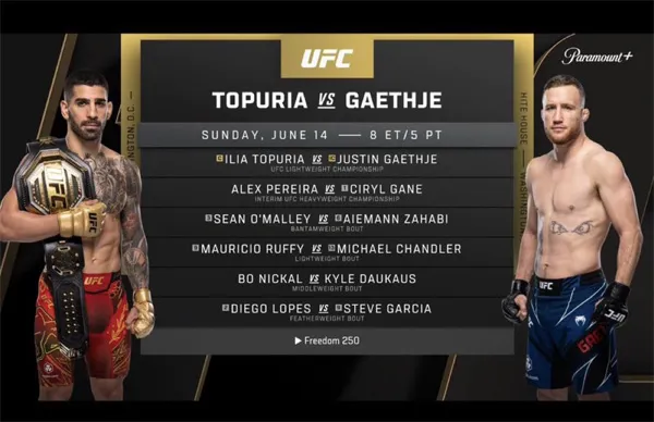 UFC는 8일 라스베가스 현장에서 6월 14일 백악관에서 열릴 'UFC 프리덤 250'의 메인 카드 매치업을 공개했다. 라이트급 챔피언 일리아 토푸리아와 잠정 챔피언 저스틴 게이치의 타이틀 매치를 포함해 총 6경기가 진행된다.