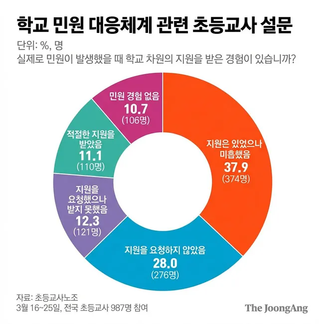 초등교사노동조합이 6일 발표한 '학교 민원 대응 체계 현장 실태조사'에서 민원 발생 시 학교 지원이 미흡하다는 응답이 38.9%로 나타났다.