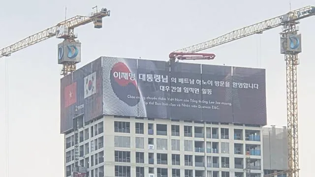 대우건설이 이재명 대통령의 베트남 국빈 방문을 환영하는 초대형 옥외광고를 하노이 도심에 설치했다. 가로 21m, 세로 25m 규모의 광고가 35층 건물 상단부에 게시돼 수 킬로미터 밖에서도 식별 가능하며, 하노이 주요 거점 지역에도 추가 광고를 운영 중이다.