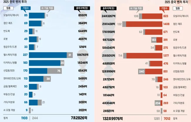 2025년 한국의 스타트업 투자 총액은 7조2826억원으로 집계된 반면 중국은 133조원(6650억 위안)에 달해 18배의 격차를 보였다. 한국은 헬스케어·미용 분야에 투자가 집중된 반면, 중국은 로봇·AI·모빌리티 등 첨단 하드웨어 산업에 막대한 자금을 쏟아부었다. 중국의 하드웨어 관련 투자는 전체의 52.6%에 달하는 4375건으로 77조8335억원이 투자됐으나, 한국은 24.4%(316건) 수준의 2조4760억원에 그쳤다.