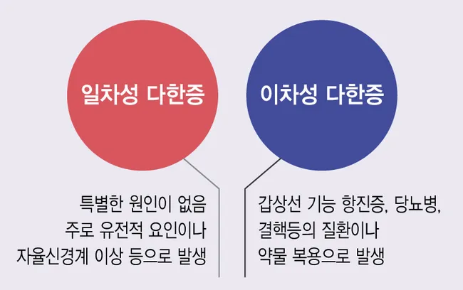 다한증은 스트레스나 감정 변화로 교감신경이 과민하게 활성화되면서 발생하는 '일차성 다한증'이 대부분이다. 신정원 분당서울대학교병원 피부과 교수는 환자들이 다한증을 방치하는 경우가 많으며, 실제로는 다양한 치료 옵션이 있다고 조언했다. 교감신경 절제술, 이온영동치료, 보톡스 주사, 항콜린성 제제, 염화알루미늄 제제, 소프피로니움 브롬화물 등 여러 치료법이 있다.