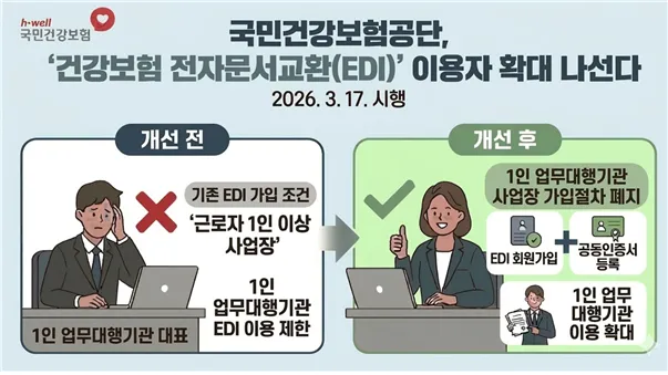 그동안 1인 업무대행기관은 실제 업무를 대행하고 있었으나 EDI 가입 조건이 '근로자 1인 이상을 사용하는 건강보험 적용 사업장'으로 제한돼 공식 시스템 이용에 제약이 있었다. 공단은 건강보험 사업장 가입절차를 폐지하고 EDI 회원가입과 공동인증서 등록만으로 업무 수행이 가능하도록 개선했다.