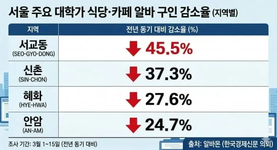 지난달 1~15일 서울 주요 대학가의 식당·카페 아르바이트 구인 공고 수는 전년 동기 대비 두 자릿수 감소를 기록했다. 서교동(45.5%), 신촌(37.3%), 혜화(27.6%) 등에서 감소 폭이 컸으며, 서울 주요 10개 대학가 원룸의 평균 월세는 2023년 1월 대비 21.0% 급등했다.