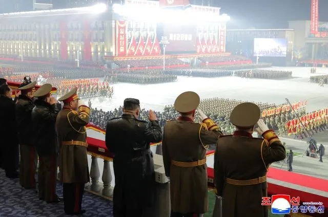 김정은 국무위원장은 25일 밤 평양 김일성광장에서 노동당 9차 대회 기념 열병식을 진행하며 "군대는 사회주의 건설의 돌격대가 돼야 한다"고 강조했다. 이번 열병식에는 1만5000여명의 병력만 참여하고 대륙간탄도미사일과 탱크 등 무기 체계는 동원되지 않았다.