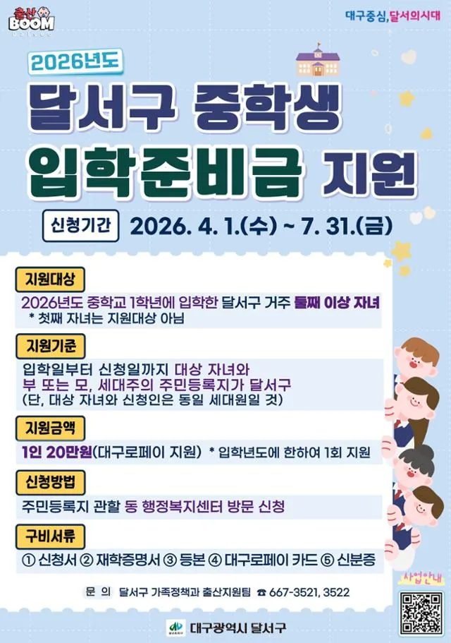 대구 달서구는 올해 중학교 입학생 중 둘째 이상 자녀를 대상으로 1인당 20만 원의 입학준비금을 지원한다고 30일 밝혔다.