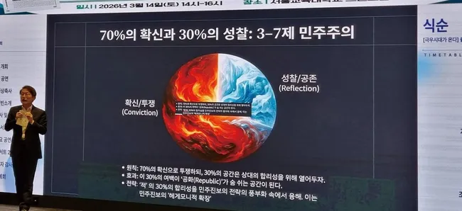 조 전 교육감은 상대 집단의 합리성을 인정하는 '3-7제 민주주의'를 제안했다. 자신이 100% 옳다고 확신하더라도 상대를 위해 30%는 열어두고, 상대 진영의 시선으로 자신을 성찰하는 '역지사지형 성찰성'을 갖자는 것이다. 그는 진보의 '내로남불'과 PC 운동의 과잉성이 극우 성장의 기반이 될 수 있다고 지적했다.