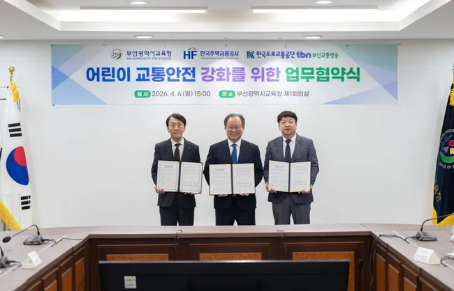 부산시교육청이 한국주택금융공사, 한국도로교통공단, tbn부산교통방송과 어린이 교통안전 강화를 위한 업무협약을 체결했다.