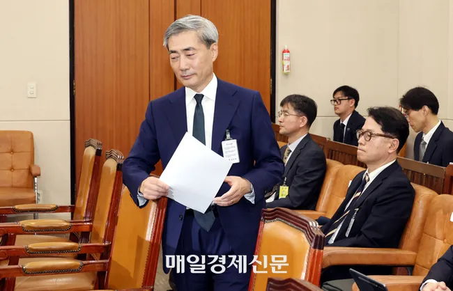 신현송 한국은행 총재 후보자가 15일 국회 재정경제기획위원회 인사청문회에서 선서를 마쳤다. 임이자 위원장에게 선서문을 전달하며 청문회 절차가 시작됐다.