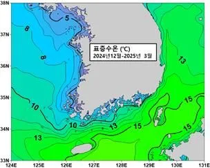 지난겨울부터 올봄까지 한반도 주변 바다의 평균 수온은 12.3도로 평년보다 1.14도, 전년보다 0.98도 높았다고 국립수산과학원이 10일 밝혔다. 1월 하순 한파를 제외한 대부분 해역에서 평년과 전년 대비 높은 수온을 기록했으며, 남해 연안은 평년보다 1.53도 높은 수치를 보였다.