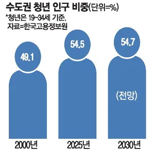 고용정보원 연구에 따르면 청년 인구 중 수도권 거주 비중이 2000년 49.1%에서 2025년 54.5%로 25년간 5.4%포인트 증가했다. 2030년에는 54.7%까지 더 늘어날 것으로 전망된다.
