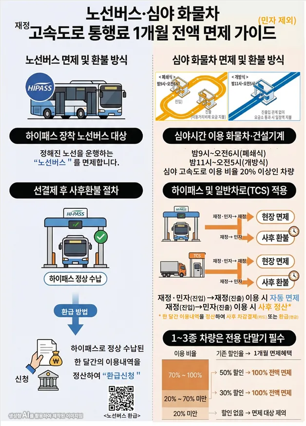 정부가 4월 16일부터 5월 15일까지 노선버스와 심야화물차의 재정고속도로 통행료를 전액 면제한다. 노선버스는 4월 16일 0시부터 5월 15일 24시까지 24시간 전 구간, 화물차는 4월 16일 오후 9시부터 5월 16일 오후 9시까지 심야시간대 100% 면제로 기존 30~50% 감면에서 확대됐다.