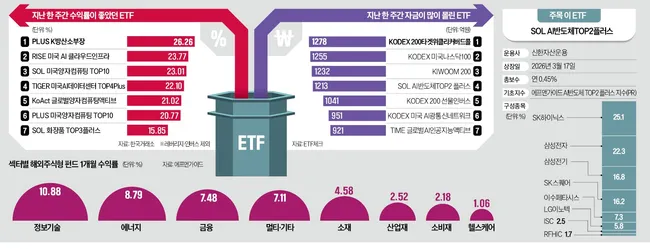 지난주 국내 증시에서 방위산업 소부장과 양자컴퓨팅 ETF가 수익률 상위권을 휩쓸었다. 'PLUS K방산소부장'이 26.26% 상승해 1위에 올랐으며, 양자컴퓨팅 관련 ETF들도 20% 이상 급등하며 상위권에 포진했다.