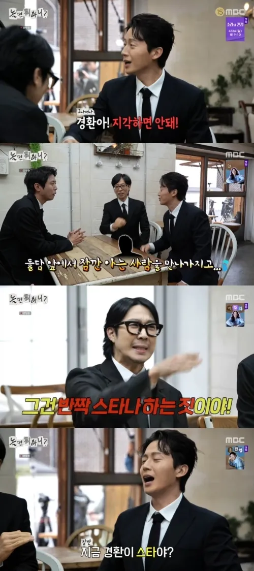 18일 방송된 '놀면 뭐하니?'에서 허경환이 촬영에 지각해 유재석에게 "옛날 같으면 엎드려 뻗쳤다"는 훈계를 들었다. 허경환은 "돌담 앞에서 아는 사람을 만났다"고 해명했지만 하하는 "그건 반짝스타나 하는 짓"이라고 몰아붙였다.