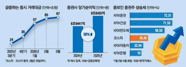 중동전쟁 여파로 코스피 변동성이 심해지는 가운데 국내 증시 거래가 활발해지면서 증권사들의 실적이 급증하고 있다. 일평균 거래대금이 60조원대에 달하고 투자자 예탁금이 120조원을 넘으면서 주요 증권사들은 주당 수백억 원대의 순이익을 기록 중이다.