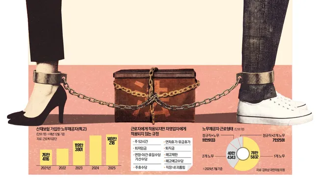 산재보험에 가입한 특수형태근로종사자가 지난해 12월 기준 149만 명을 넘어섰으며, 가입 의무가 없는 직종까지 포함하면 실제 프리랜서는 훨씬 더 많을 것으로 추정된다. 1953년 제정된 근로기준법은 일하는 사람을 '근로자' 아니면 '사업주'로만 구분해 회색지대 노동자들이 법적 보호를 받지 못하고 있다.