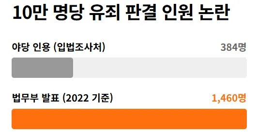 법무부는 23일 이재명 대통령의 '웬만한 사람은 전과가 다 있다'는 발언이 가짜뉴스라는 야당 비판에 대해 법원 통계를 근거로 공식 반박했다. 법무부는 2022년 기준 유죄 판결 인원이 총 75만798명으로 인구 10만 명당 약 1460명 수준이라고 밝혔으며, 이는 야권이 제시한 '인구 10만 명당 약 384명'이라는 수치를 정면으로 뒤집는 결과다.