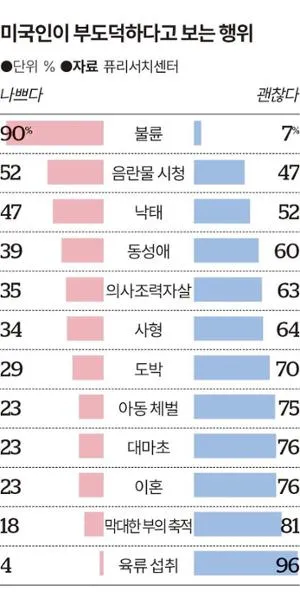 미국 퓨리서치센터가 성인 1만2,500여 명을 대상으로 조사한 결과, 불륜을 비도덕적 행위로 지목한 비율이 90%로 가장 높았다. 정파와 종교를 초월해 미국인 대부분이 불륜을 도덕적으로 용납할 수 없다고 답했으며, 반면 대마초 사용을 도덕적으로 나쁘지 않다고 본 미국인은 76%에 달했다.