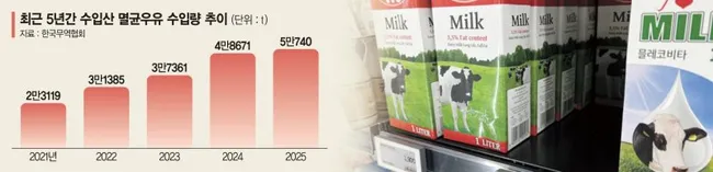 지난해 수입 멸균우유에 무관세 조치가 시행된 이후 1월 수입량이 전년 동기 대비 8.4% 증가했다. 수입산 멸균우유는 L당 1500~2000원 선으로 국산 신선우유(2970원 이상)의 절반 가격에 판매되고 있다.
