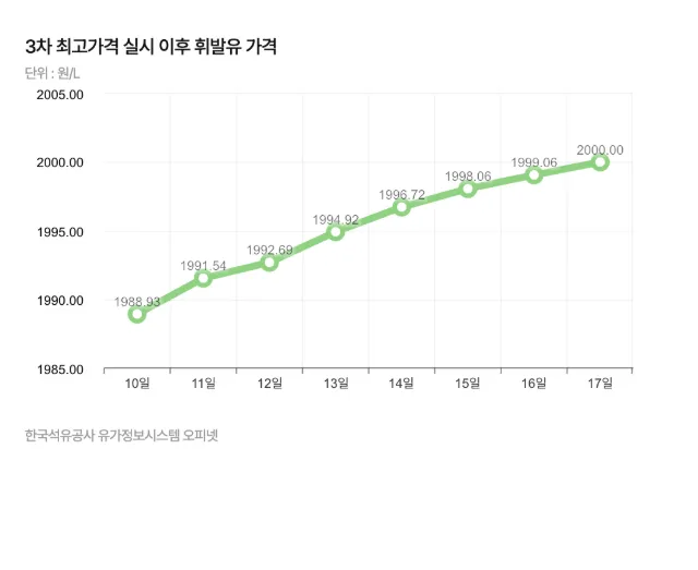 전국 주유소의 휘발유 가격이 17일 L당 2,000원을 기록했다. 이는 러시아·우크라이나 전쟁으로 유가가 폭등했던 2022년 5~7월 이후 4년여 만의 일이다.