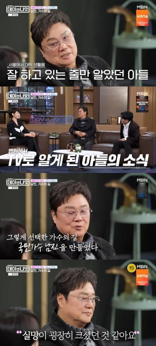 가수 남진이 21일 방송된 MBN '김주하의 데이앤나잇'에서 아버지 몰래 가수가 됐던 사연을 밝혔다. 남진은 병원에 입원 중이던 아버지가 TV를 통해 자신의 가수 활동을 알게 됐으며, 아버지는 풍각쟁이가 되려 한다며 크게 실망했다고 전했다.