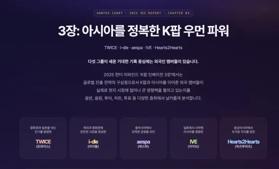한터글로벌이 운영하는 한터차트는 17일 연간 보고서 '한터 리와인드: 2025, K팝 인베이젼'의 세 번째 장을 공개했다. 이번 3장은 '아시아를 정복한 K팝 우먼파워'라는 타이틀로 트와이스, 아이들, 에스파, 아이브, 하츠투하츠의 2025년 활약상을 데이터로 정리했다.