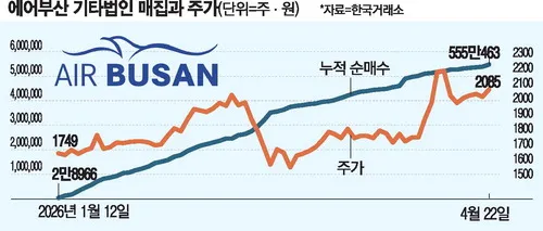 에어부산 주식을 기타법인이 올해 1월 12일부터 100일 동안 매일 매수하는 이례적 움직임이 포착됐다. 상위 10개 계좌의 매수 관여율이 43%에 달해 소수 계좌 거래 집중 종목으로 지정돼 투자주의종목이 됐으며, 같은 기간 주가는 1749원에서 2085원으로 20% 가까이 상승했다.