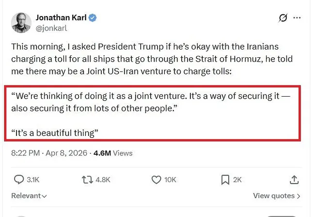 트럼프 대통령이 이란과 호르무즈 해협 통행료를 공동 징수하는 합작사업 방안을 검토 중이라고 밝혔다. 이란은 2주 휴전 기간 동안 해협 통과 선박에 원유 1배럴당 1달러의 통행료를 암호화폐로 징수하고 있다.