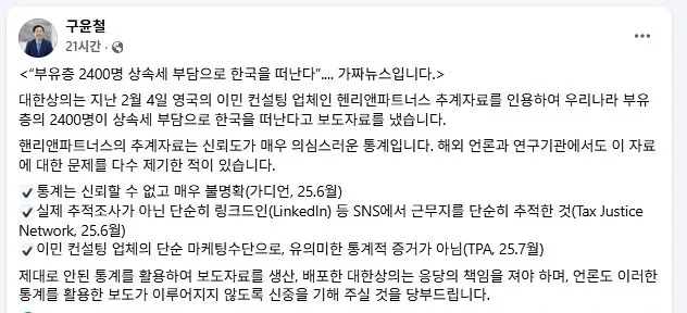 구윤철 부총리 겸 재정경제부 장관이 대한상공회의소가 발표한 '고액 자산가의 탈한국' 보도자료에 대해 "부유층 2400명이 상속세 부담으로 한국을 떠난다는 것은 가짜뉴스"라고 지적했다. 구 부총리는 페이스북을 통해 해당 추계 자료의 신뢰도를 문제 삼으며 대한상의의 책임과 언론의 신중한 보도를 촉구했다.
