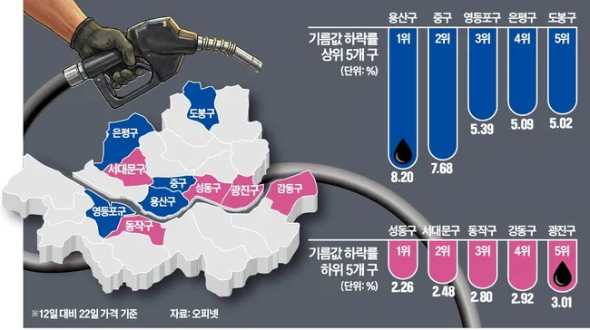 석유 최고가격제 시행 10일, 서울 자치구별 휘발유 가격 하락폭 최대 4배 차이