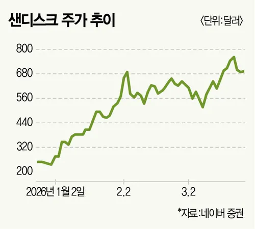 월가는 샌디스크의 올해 매출을 153억9400만달러, 내년 265억9400만달러로 전망하며 목표주가를 900~1000달러로 제시했다. 다만 반도체 업종 약세와 단기 차익 실현으로 최근 변동성이 확대된 상황이다.