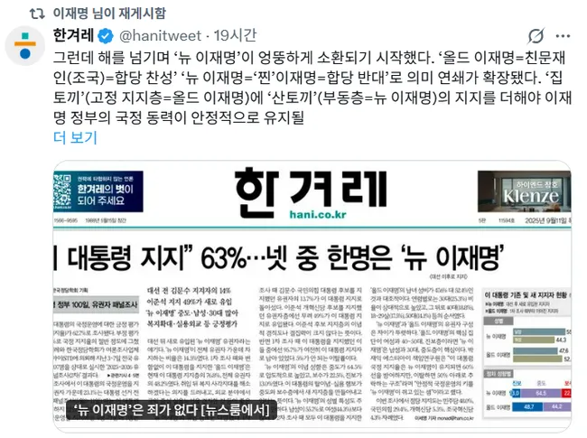 칼럼은 이 대통령의 지지층이 이념 기반의 '올드 이재명'과 중도 성향의 '뉴 이재명'으로 구분되지만, 민주당과 조국혁신당 합당 갈등 과정에서 이 둘이 정파적으로 재해석됐다고 지적했다. 집권 여당의 내부 갈라치기와 권력투쟁의 언어로 변질됐다는 비판이 담겼다.
