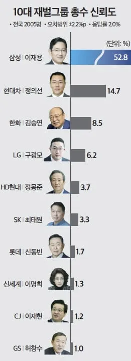 가장 신뢰받는 재벌 총수는?…이재용 삼성 회장 52.8%로 1위