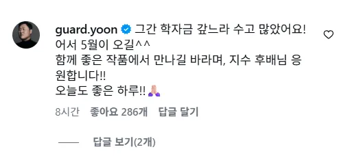 배우 윤경호가 19일 후배 배우 최지수의 SNS 댓글에 응원 메시지를 남겼다. 윤경호는 "그동안 학자금을 갚느라 수고가 많았다"며 "어서 5월이 오길 바란다. 함께 좋은 작품에서 만나길 기대하며 지수 후배님을 응원한다"고 밝혔다.