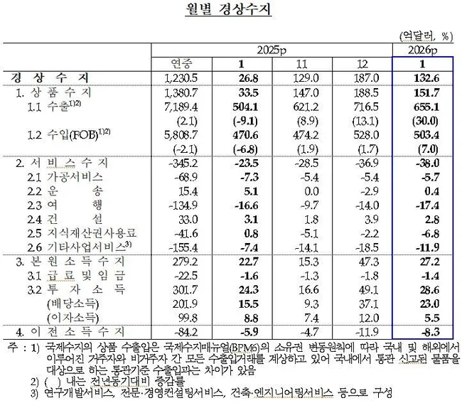 2026년 1월 경상수지가 132억6000만달러 흑자를 기록하며 33개월 연속 흑자 흐름을 이어갔다. 1월 기준 역대 최대 규모다. 상품수지는 151억7000만달러로 역대 3위를 기록했다.