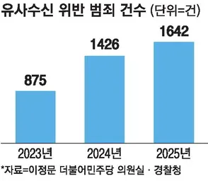 유튜브와 SNS 등 온라인 채널을 통한 유사수신 사기가 급증하고 있다. 경찰청 자료에 따르면 유사수신행위 위반 적발 건수는 2023년 875건에서 2024년 1426건, 2025년 1642건으로 2년 만에 거의 두 배 증가했다.