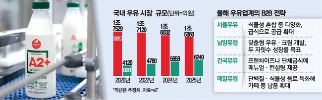 국내 우유 B2C 시장이 5년간 2000억원 이상 축소되는 가운데 B2B 시장은 연평균 8.7% 성장하며 대조를 이루고 있다. 2020년 4120억원에서 2024년 5658억원, 지난해 6240억원으로 늘어난 B2B 시장을 놓고 서울우유, 남양유업, 건국유업 등 주요 유업체들이 프랜차이즈별 맞춤형 제품 개발과 공급 범위 확대에 나서고 있다.