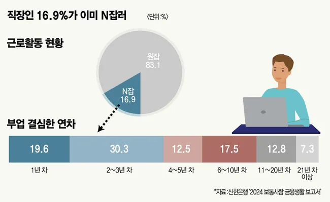 경제활동인구 10명 중 1명이 본업과 함께 부업을 하는 N잡러가 되었다. 국가데이터처 집계 기준 약 68만명이지만 신한은행 조사에선 직장인의 16.9%가 N잡러로 최대 300만명으로 추정된다.