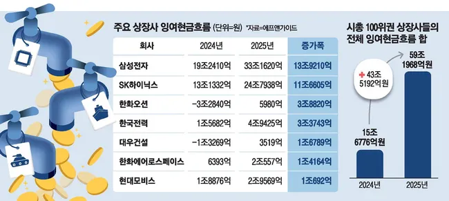 시가총액 100위권 기업의 잉여현금흐름(FCF)이 2025년 59조2000억원으로 전년 15조7000억원 대비 43조5000억원 증가했다. 반도체·조선·방산 중심 순이익 확대가 주요 원인이다.