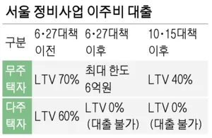 6·27 대책과 10·15 대책으로 무주택 조합원 대출 한도가 6억원으로 제한되고 서울 전역이 투기과열지구로 묶이면서 LTV가 40%로 축소됐다. 기본 이주비 금리가 3~4%인 반면 추가 이주비는 보증 수수료와 가산금리가 붙어 6~7%대가 일반적이며, 1억원을 4년간 사용할 경우 상환액은 약 1억2400만원에 이른다.