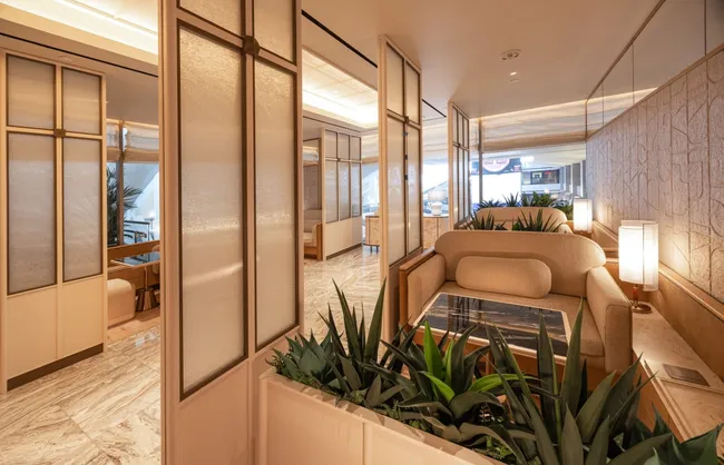 일등석 라운지에는 퍼스널 다이닝 '아라카르트'가, 마일러 클럽 및 프레스티지 라운지에는 오픈 키친 방식 라이브 스테이션이 운영된다. 한국적 절제미와 현대 디자인을 결합한 '모던 코리안 럭셔리' 콘셉트로 공간을 구성했다.