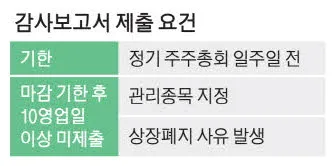감사보고서 제출 기한 초과 후 10영업일이 넘으면 관리종목으로 지정되고 사업보고서 공시 마감 불이행은 상장폐지 사유가 된다. 엔켐은 감사보고서 제출 지연 공시 후 주가가 하한가를 기록했다가 제출 후 급반등했으며, 하이젠알앤앰과 필옵틱스는 제출 후 감사의견 비적정이나 정정 기재 등의 부정적 내용이 기재됐다.