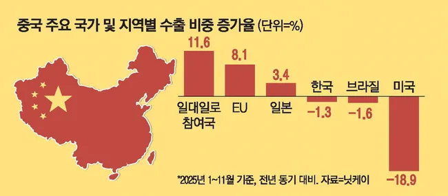 중국이 2025년 무역 흑자에서 일대일로 참여국의 비중을 45%까지 높이면서 처음으로 미국(24%)을 넘어섰다. 1~11월 일대일로 참여국 대상 수출은 전년 동기 대비 11.6% 증가해 전체 수출 증가율 5.4%를 크게 웃돌았으며, 대미 무역 흑자 비중은 2018년 90%에서 급락했다.
