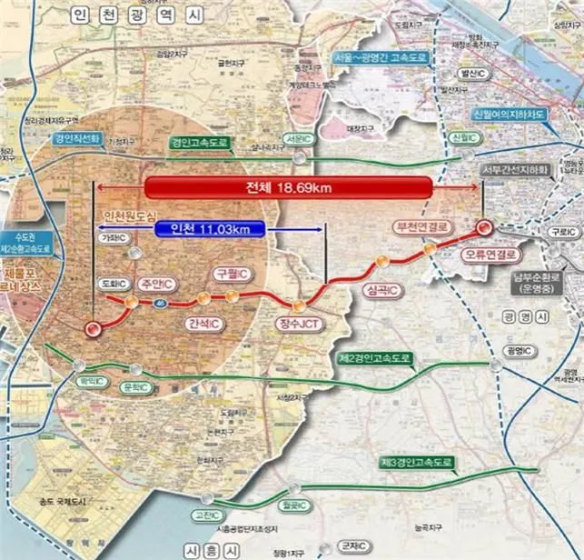 2024년 7월 롯데건설이 민간투자사업으로 제안한 이 사업은 B/C 1.25, AHP 0.64로 경제성을 인정받았다. 2035년 기준 경인고속도로 교통량 10.2%, 제2경인고속도로 교통량 13.2% 감소 효과가 예상된다.
