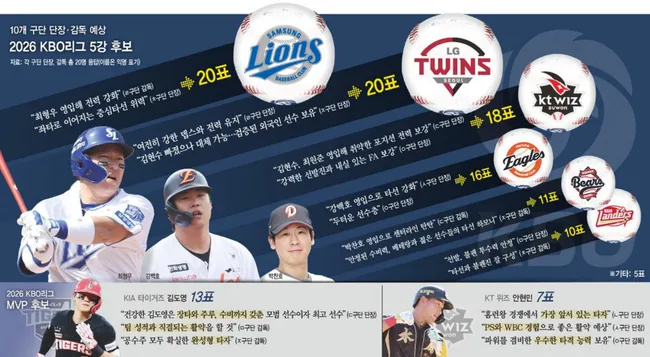 케이티 위즈는 김현수·최원준·한승택 영입으로 강력한 선발진을 갖췄고, 한화 이글스는 왕옸청 영입과 강백호 계약으로 타선을 강화했다. 두산 베어스와 에스에스지 랜더스도 각각 11표와 10표를 받으며 5강 후보로 평가됐다.