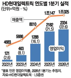 HD현대일렉트릭이 2026년 1분기 매출 1조325억원, 영업이익 2334억원을 기록할 것으로 예상되며 영업이익률은 22.6%에 달할 전망이다.