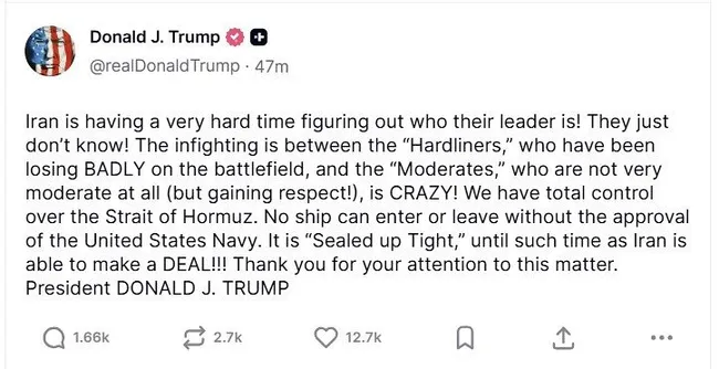 트럼프 미국 대통령이 호르무즈해협에 기뢰를 설치하는 모든 선박을 격침하라고 미 해군에 명령했다. 이란 해군 함정 159척이 바다 밑에 가라앉아 있다고 주장했으며, 기뢰 제거 작전 규모를 3배로 확대하라고 명령했다.