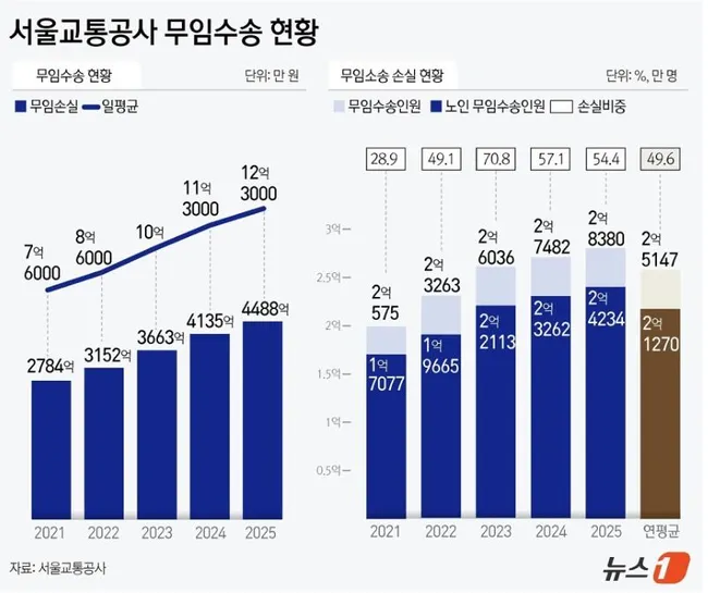 서울교통공사 등 도시철도운영기관들은 무임수송으로 인한 연간 손실이 7000억원을 초과하며, 이 중 80% 이상이 노인 무임승차라고 토로했다. 고령화로 무료 승객 비중이 급증하는 가운데 중앙정부 지원은 전무하고, 요금 인상도 어려워 운영기관들의 적자가 심화되고 있다.