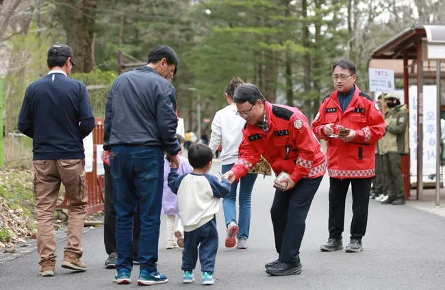 박은식 산림청장이 12일 충북 보은 속리산국립공원 일대에서 봄철 산불 예방 대국민 홍보 활동을 전개했다. 상춘객·등산객을 대상으로 산불 예방 중요성을 알리고 화기 사용 자제를 당부했다.