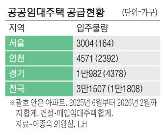 2025년 6월부터 2026년 2월까지 LH의 서울 신규 공공임대 물량은 총 3004가구이나 아파트는 5.45%에 불과했다. 공급 물량의 53%가 60㎡ 이하 소형 주택으로 가족 단위 수요를 충족하기 어렵다는 지적이다.